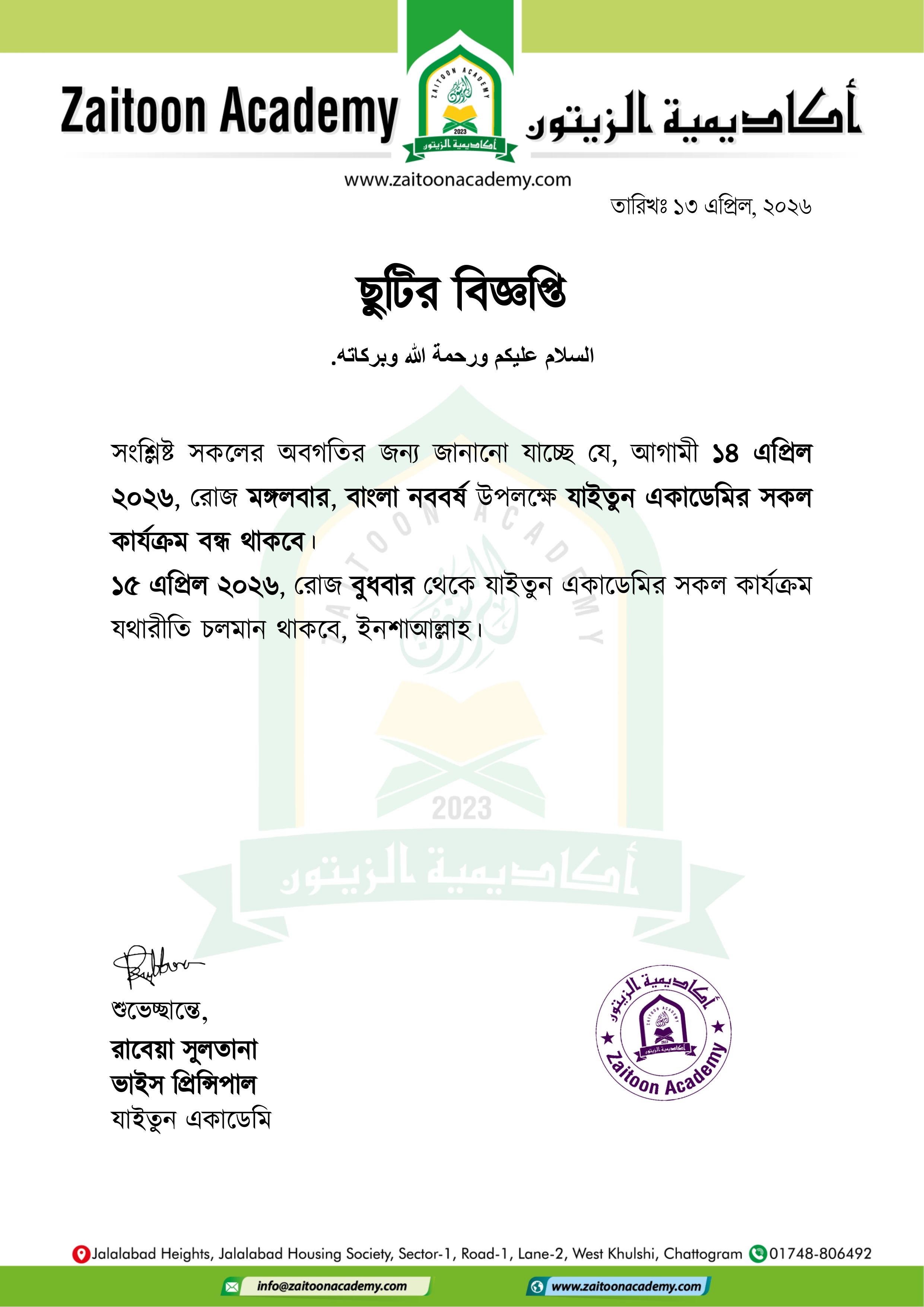 তারিখঃ ১৩ এপ্রিল, ২০২৬ ছুটির বিজ্ঞপ্তি السلام عليكم ورحمة الله وبركاته. সংশ্লিষ্ট সকলের অবগতির জন্য জানানো যাচ্ছে যে, আগামী ১৪ এপ্রিল ২০২৬, রোজ মঙ্গলবার, বাংলা নববর্ষ উপলক্ষে যাইতুন একাডেমির সকল কার্যক্রম বন্ধ থাকবে। ১৫ এপ্রিল ২০২৬, রোজ বুধবার থেকে যাইতুন একাডেমির সকল কার্যক্রম যথারীতি চলমান থাকবে, ইনশাআল্লাহ। শুভেচ্ছান্তে, রাবেয়া সুলতানা ভাইস প্রিন্সিপাল যাইতুন একাডেমি