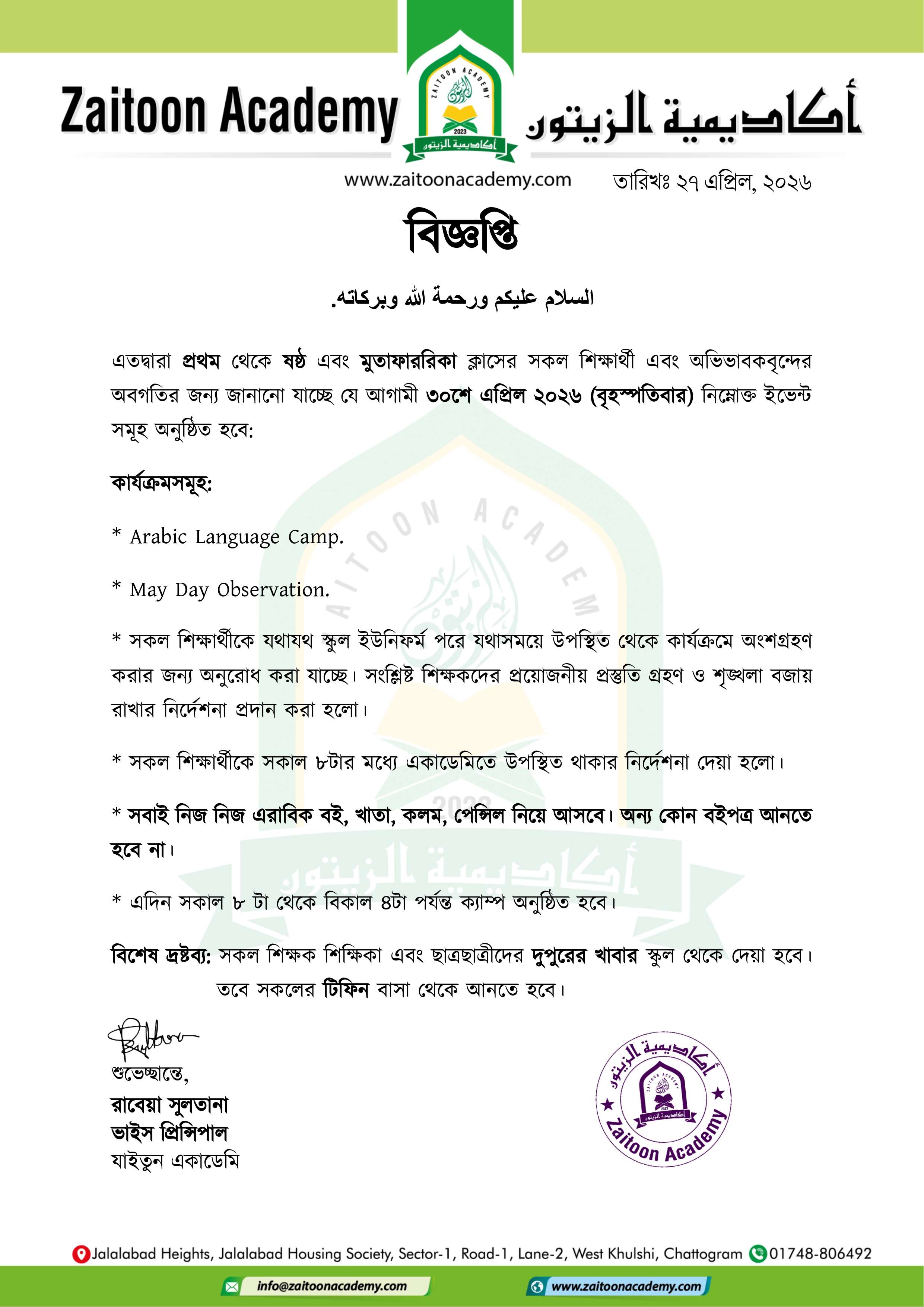 তারিখঃ ২৭ এপ্রিল, ২০২৬ বিজ্ঞপ্তি السلام عليكم ورحمة الله وبركاته. এতদ্বারা প্রথম থেকে ষষ্ঠ এবং মুতাফাররিকা ক্লাসের সকল শিক্ষার্থী এবং অভিভাবকবৃন্দের অবগতির জন্য জানানো যাচ্ছে যে আগামী ৩০শে এপ্রিল ২০২৬ (বৃহস্পতিবার) নিম্নোক্ত ইভেন্ট সমূহ অনুষ্ঠিত হবে: কার্যক্রমসমূহ: * Arabic Language Camp. * May Day Observation. * সকল শিক্ষার্থীকে যথাযথ স্কুল ইউনিফর্ম পরে যথাসময়ে উপস্থিত থেকে কার্যক্রমে অংশগ্রহণ করার জন্য অনুরোধ করা যাচ্ছে। সংশ্লিষ্ট শিক্ষকদের প্রয়োজনীয় প্রস্তুতি গ্রহণ ও শৃঙ্খলা বজায় রাখার নির্দেশনা প্রদান করা হলো। * সকল শিক্ষার্থীকে সকাল ৮টার মধ্যে একাডেমিতে উপস্থিত থাকার নির্দেশনা দেয়া হলো। * সবাই নিজ নিজ এরাবিক বই, খাতা, কলম, পেন্সিল নিয়ে আসবে। অন্য কোন বইপত্র আনতে হবে না। * এদিন সকাল ৮ টা থেকে বিকাল ৪টা পর্যন্ত ক্যাম্প অনুষ্ঠিত হবে। বিশেষ দ্রষ্টব্য: সকল শিক্ষক শিক্ষিকা এবং ছাত্রছাত্রীদের দুপুরের খাবার স্কুল থেকে দেয়া হবে। তবে সকলের টিফিন বাসা থেকে আনতে হবে। শুভেচ্ছান্তে, রাবেয়া সুলতানা ভাইস প্রিন্সিপাল যাইতুন একাডেমি