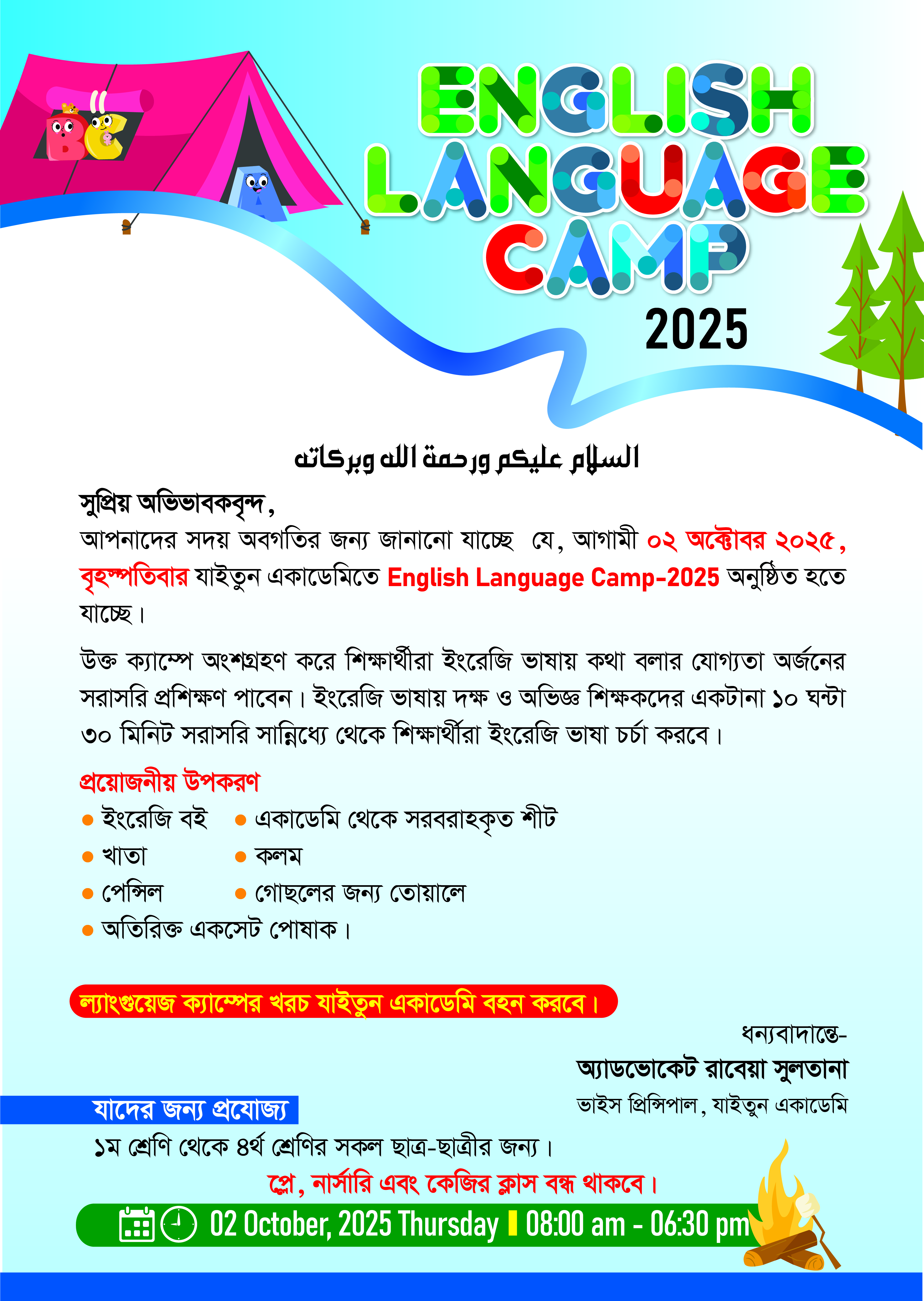 English Language Camp - 2025 Recent Notice Recruitment Written Exam Result for Session-2026 ২০২৬ সেশনে প্রমোশন সম্পর্কিত গুরুত্বপূর্ণ নির্দেশনা Invitation to Written Test – Recruitment 2026 English Language Camp - 2025 পবিত্র ঈদে মিলাদুন্নবী ﷺ উপলক্ষে ছুটির বিজ্ঞপ্তি | ০৬ সেপ্টেম্বর ২০২৫ টাইফয়েড (TCV) টিকাদান সংক্রান্ত নোটিশ ৩য় অভিভাবক-শিক্ষক সম্মেলন (PTM) ২০২৫ - এর সময়সূচী | ৩০ আগস্ট ২০২৫, শনিবার Mid-Term Exam Schedule | Autumn-2025 জুলাই গণঅভ্যুত্থান দিবস উপলক্ষে ছুটির বিজ্ঞপ্তি | ০৫ অগাস্ট, ২০২৫ Class Wise Fruit List | Fruit Festival 2025 Fruit Festival - 2025, Fruit List By Class Notice Regarding Qurban Dish Party Spring Final Examination Schedule - 2025 Notice Regarding PTM, Hajj Simulation, Final Exam & Eid Vacation Special Vacation Notice due to the heatwave | তীব্র তাপপ্রবাহের কারণে বিশেষ ছুটির বিজ্ঞপ্তি