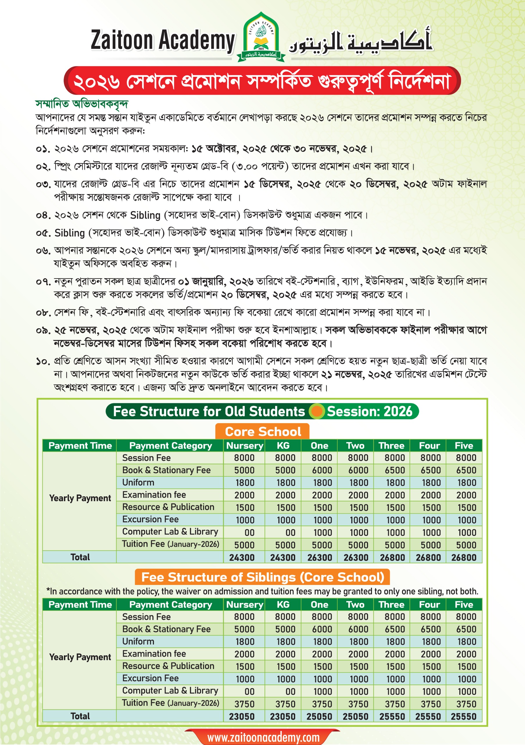 সম্মানিত অভিভাবকবৃন্দ আপনাদের যে সমস্ত সন্তান যাইতুন একাডেমিতে বর্তমানে লেখাপড়া করছে ২০২৬ সেশনে তাদের প্রমোশন সম্পন্ন করতে নিচের নির্দেশনাগুলো অনুসরণ করুন: ১. ২০২৬ সেশনের মাইগ্রেশনের সময়কাল: ১৫ অক্টোবর থেকে ৩০ নভেম্বর, ২০২৫। ২. স্প্রিং সেমিস্টারে যাদের রেজাল্ট নূন্যতম গ্রেড-বি ( ৩.০০ পয়েন্ট) তাদের প্রমোশন এখন করা যাবে। ৩. যাদের রেজাল্ট গ্রেড-বি এর নিচে তাদের প্রমোশন ১৫ ডিসেম্বর থেকে ২০ শে ডিসেম্বর, ২০২৫ অটাম ফাইনাল পরীক্ষায় সন্তোষজনক রেজাল্ট সাপেক্ষে করা যাবে। ৪. ২০২৬ সেশন থেকে Sibling (সহোদর ভাই-বোন) ডিসকাউন্ট শুধুমাত্র একজন পাবে। ৫. Sibling (সহোদর ভাই-বোন) ডিসকাউন্ট শুধুমাত্র মাসিক টিউশন ফিতে প্রযোজ্য। ৬. আপনার সন্তানকে ২০২৬ সেশনে অন্য স্কুল/মাদরাসায় ট্রান্সফার/ভর্তি করার নিয়ত থাকলে ১৫ নভেম্বর, ২০২৫ এর মধ্যেই যাইতুন অফিসকে অবহিত করুন। ৭. নতুন পুরাতন সকল ছাত্র ছাত্রীদের ০১লা জানুয়ারি, ২০২৬ ইং তারিখে বই-স্টেশনারি, ব্যাগ, ইউনিফরম, আইডি ইত্যাদি প্রদান করে ক্লাস শুরু করতে সকলের ভর্তি/মাইগ্রেশন ২০ ডিসেম্বর, ২০২৫ এর মধ্যে সম্পন্ন করতে হবে। ৮. সেশন ফি, বুক-স্টেশনারি এবং বাৎসরিক অন্যান্য ফি বকেয়া রেখে কারো মাইগ্রেশন সম্পন্ন করা যাবে না। ৯. ২৫ নভেম্বর ২০২৫ ইং থেকে অটাম ফাইনাল পরীক্ষা শুরু হবে ইনশাআল্লাহ। সকল অভিভাবককে ফাইনাল পরীক্ষার আগে নভেম্বর-ডিসেম্বর মাসের টিউশন ফিসহ সকল বকেয়া পরিশোধ করতে হবে। ১০. প্রতি শ্রেণিতে আসন সংখ্যা সীমিত হওয়ার কারণে আগামী সেশনে সকল শ্রেণিতে হয়ত নতুন ছাত্র-ছাত্রী ভর্তি নেয়া যাবে না। আপনাদের অথবা নিকটজনের নতুন কেউ ভর্তি করার ইচ্ছা থাকলে ২১ নভেম্বর, ২০২৫ ইং তারিখের এডমিশন টেস্টে অংশগ্রহণ করাতে হবে; এজন্য অতি দ্রুত অনলাইনে আবেদন করতে হবে।