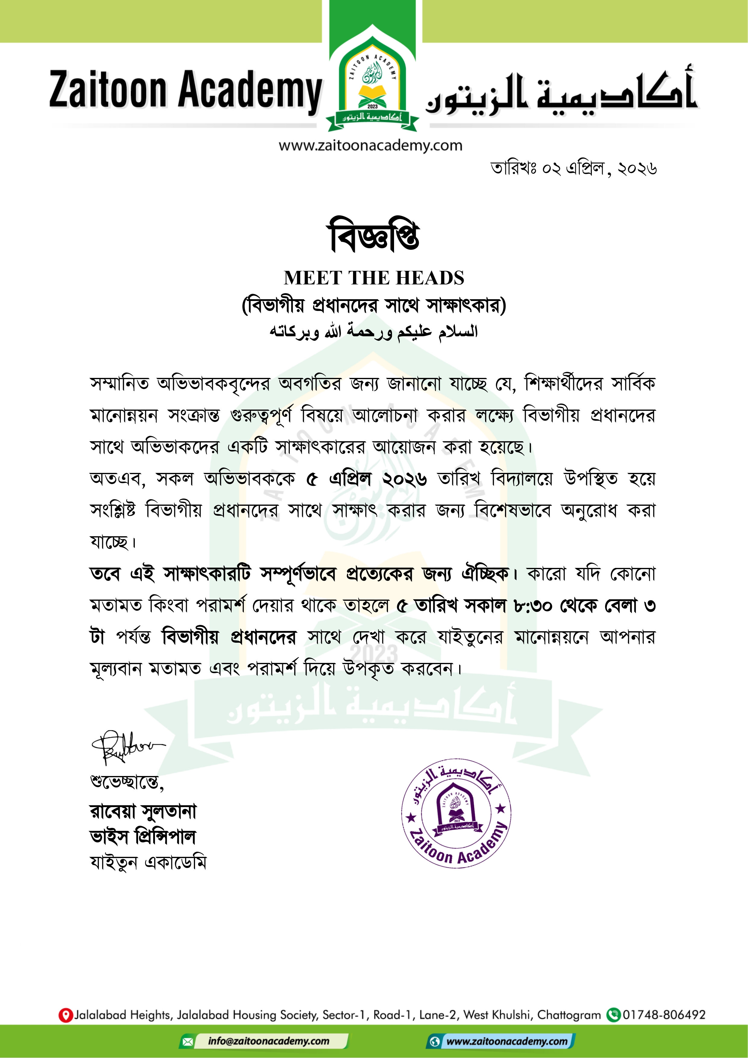 তারিখঃ ০২ এপ্রিল, ২০২৬ বিজ্ঞপ্তি MEET THE HEADS (বিভাগীয় প্রধানদের সাথে সাক্ষাৎকার) السلام عليكم ورحمة الله وبركاته সম্মানিত অভিভাবকবৃন্দের অবগতির জন্য জানানো যাচ্ছে যে, শিক্ষার্থীদের সার্বিক মানোন্নয়ন সংক্রান্ত গুরুত্বপূর্ণ বিষয়ে আলোচনা করার লক্ষ্যে বিভাগীয় প্রধানদের সাথে অভিভাকদের একটি সাক্ষাৎকারের আয়োজন করা হয়েছে। অতএব, সকল অভিভাবককে ৫ এপ্রিল ২০২৬ তারিখ বিদ্যালয়ে উপস্থিত হয়ে সংশ্লিষ্ট বিভাগীয় প্রধানদের সাথে সাক্ষাৎ করার জন্য বিশেষভাবে অনুরোধ করা যাচ্ছে। তবে এই সাক্ষাৎকারটি সম্পূর্ণভাবে প্রত্যেকের জন্য ঐচ্ছিক। কারো যদি কোনো মতামত কিংবা পরামর্শ দেয়ার থাকে তাহলে ৫ তারিখ সকাল ৮:৩০ থেকে বেলা ৩ টা পর্যন্ত বিভাগীয় প্রধানদের সাথে দেখা করে যাইতুনের মানোন্নয়নে আপনার মূল্যবান মতামত এবং পরামর্শ দিয়ে উপকৃত করবেন। শুভেচ্ছান্তে, রাবেয়া সুলতানা ভাইস প্রিন্সিপাল যাইতুন একাডেমি